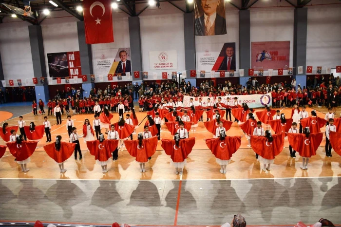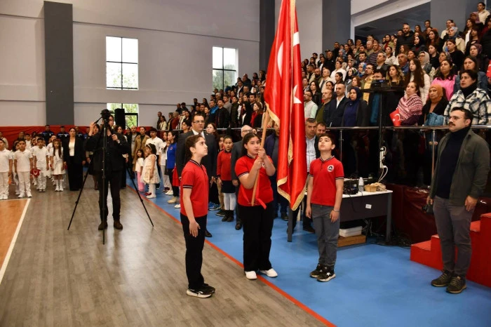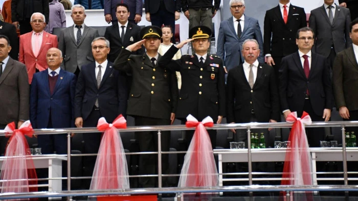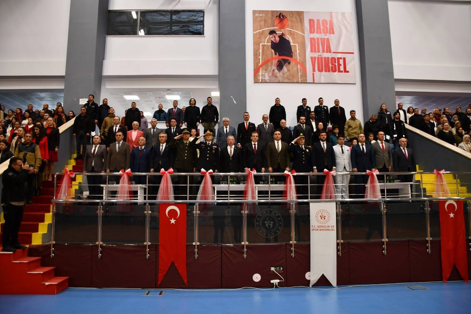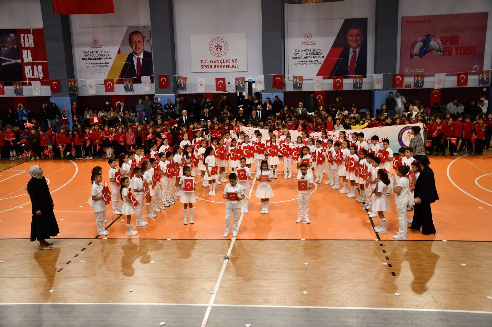 Çelenk sunumu sonrasında kutlama programı Ramiz Turan Spor Kompleksi'nde düzenlenen tören ile devam etti.