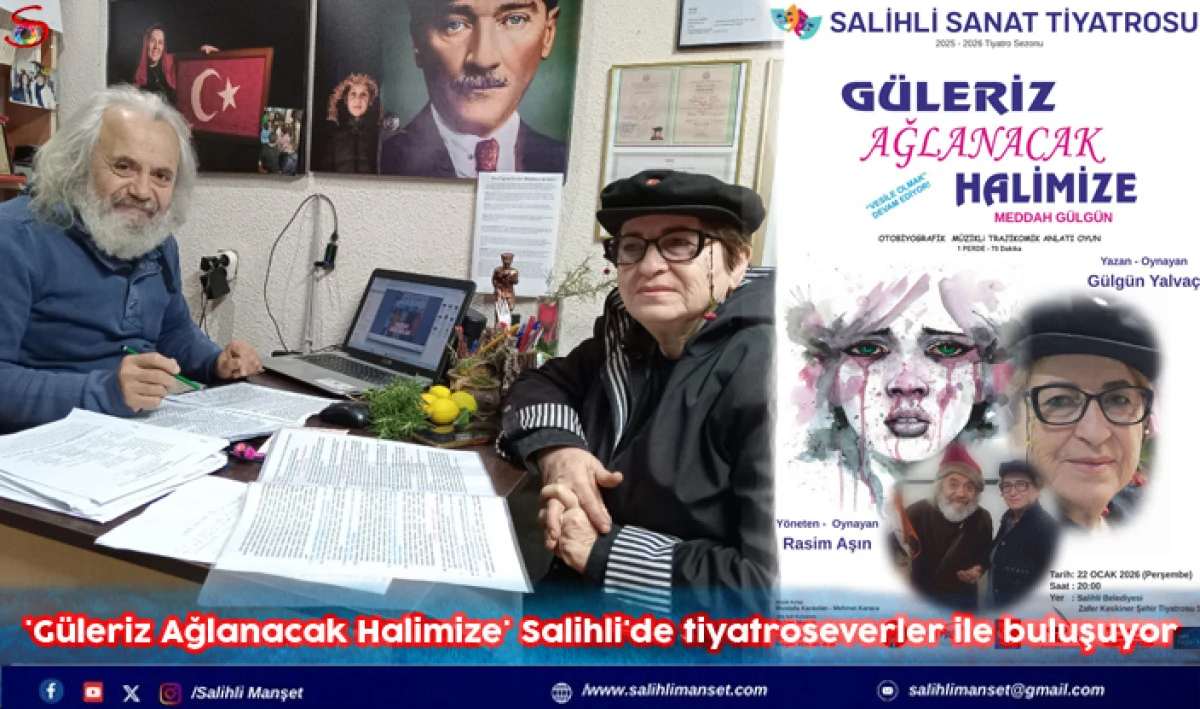 Salihli Sanat Tiyatrosu Gazeteci-Yazar Aktivist Gülgün Yalvaç’ın yaşamından seçtiği anıları birazda gülümsetmek ümidiyle kaleme aldığı yaratıcı drama temelli otobiyografi müzikli anlatı oyunu “Güleriz Ağlanacak Halimize” 22 Ocak 2026 Perşembe gümü saat 20.00’de tiyatro severler ile buluşuyor. Salihli’de Belediye Şehir Tiyatrosu Yönetmeni ve Eğitmeni Doç. Dr. Rasim Aşın , ”Salihli Belediyesi Şehir Tiyatrosu’nda göreve başladığım günlerde, şehrimizi yeniden tiyatronun merkezi konumuna getirmek için çalışacağımızı, tiyatro yaşamına yön vermiş sanatçıların, akademisyen ve usta oyuncuların, yazarların eserlerine öncelik vereceğimizi belirtmiştik.