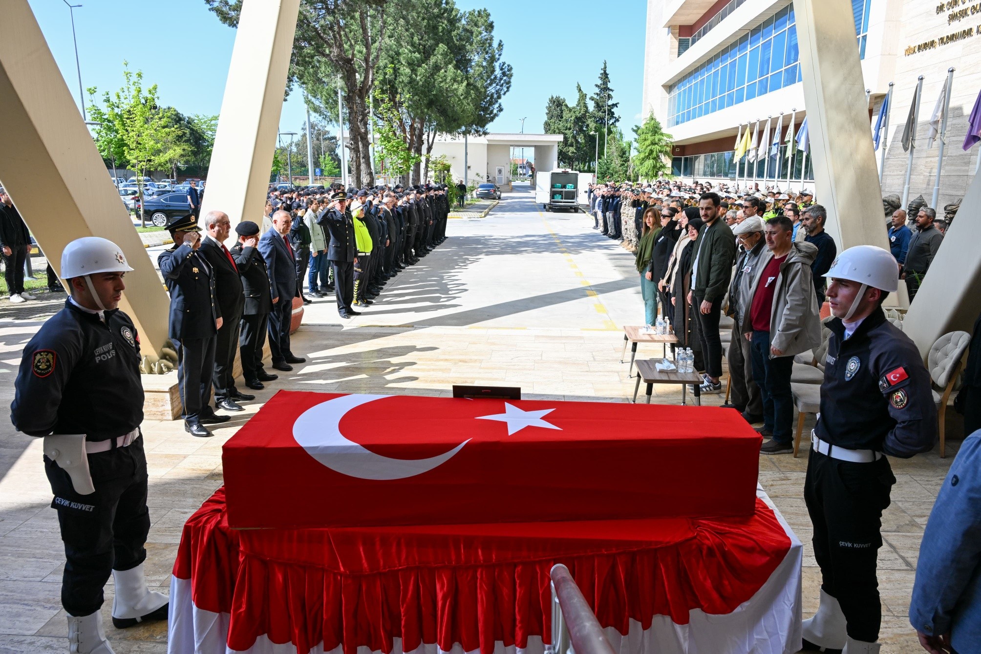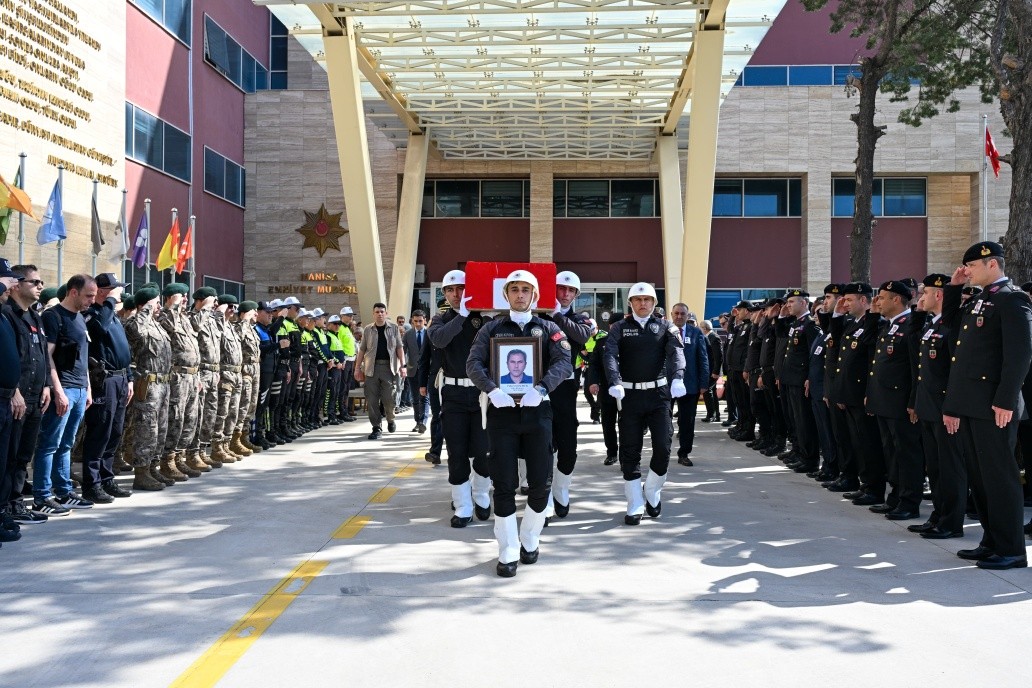 Manisa'nın Yunusemre ilçesinde meydana gelen feci trafik kazasında hayatını kaybeden polis memuru Halil Kösemen için Manisa İl Emniyet Müdürlüğü bahçesinde cenaze töreni düzenlendi.
