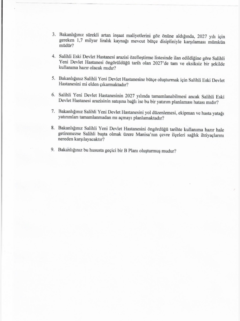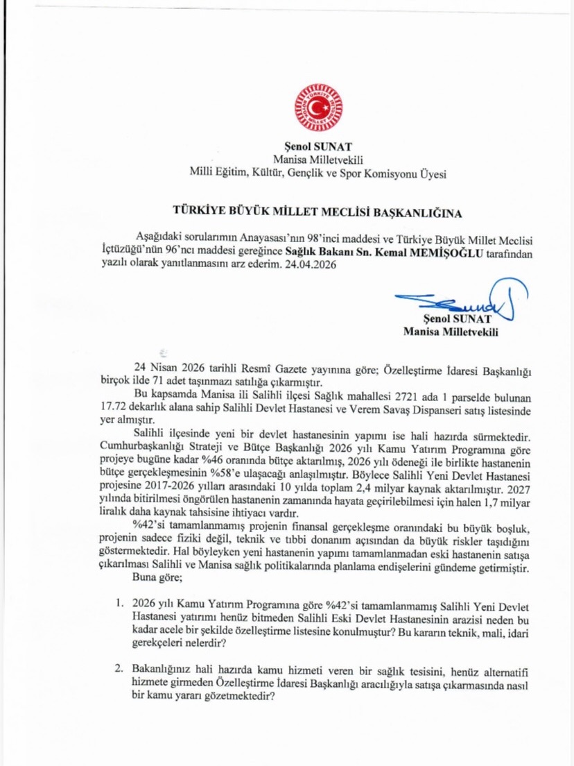 İYİ Parti Genel Başkan Yardımcısı ve Manisa Milletvekili Şenol Sunat, konuyu Türkiye Büyük Millet Meclisi’ne taşıyarak Sağlık Bakanlığı’na soru önergesi verdi. Sunat, 2026 yılı Kamu Yatırım Programı’na göre yeni hastane projesinin yalnızca yüzde 42 seviyesinde tamamlandığını belirtti.