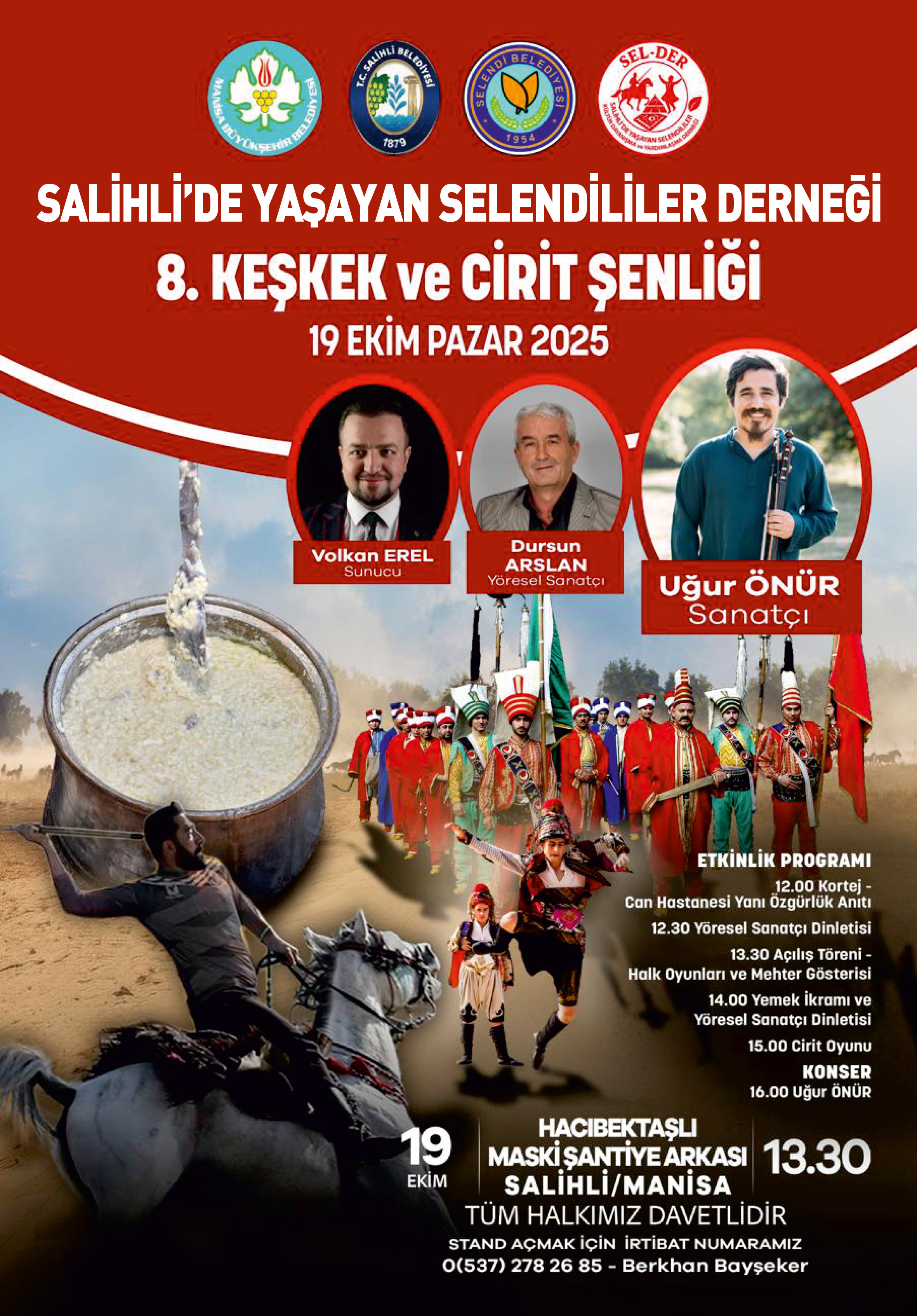 Salihli’de Yaşayan Selendililer Derneği, geleneksel hale gelen Keşkek ve Cirit Şenliği’nin 8’incisini bu yıl 19 Ekim Pazar günü düzenliyor.