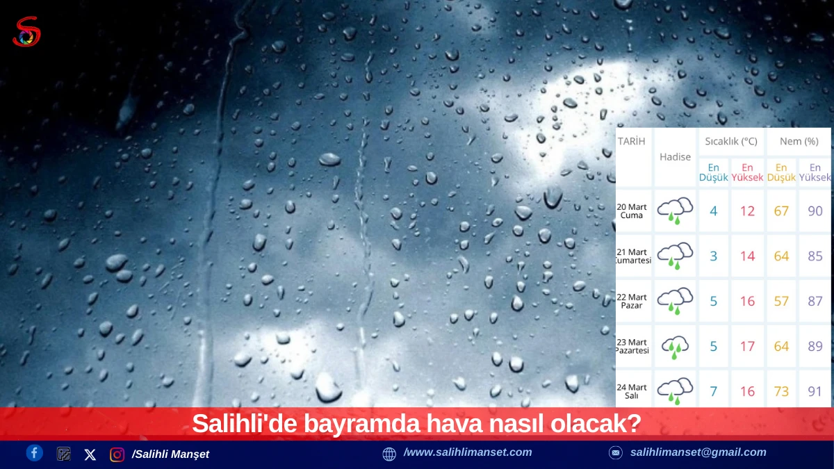 Meteoroloji 2. Bölge Müdürlüğü’nün yayımladığı 5 günlük tahmine göre, Salihli ve çevresinde Ramazan Bayramı boyunca genel olarak çok bulutlu ve yağışlı hava etkili olacak.