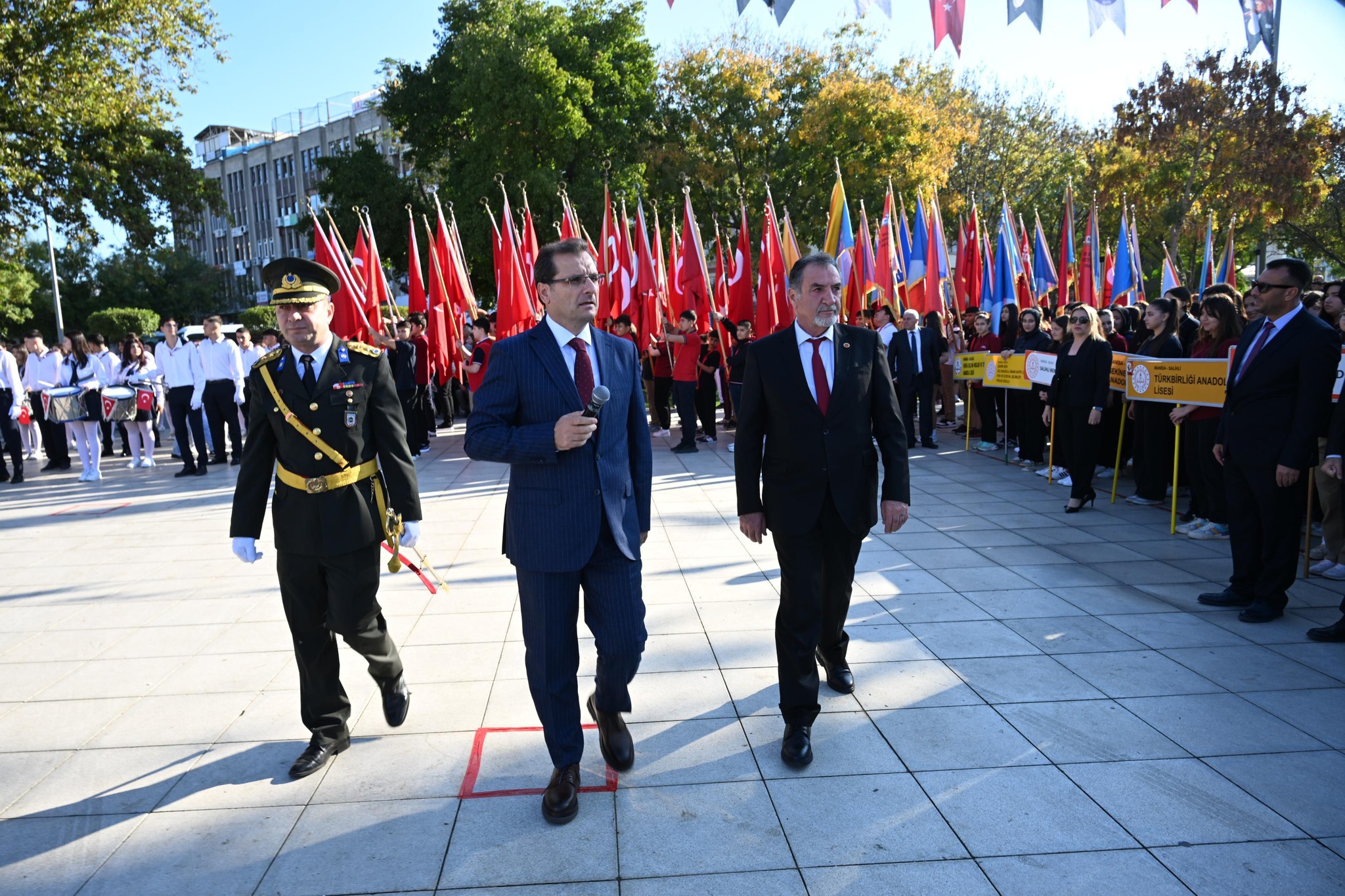 Tebrikat töreninin sona ermesinin ardından protokol, kutlama ve geçiş töreni için Atatürk Kent Meydanı’na geçti. Meydanda her yaştan vatandaş, ellerinde Türk bayrakları ile hazır bulundu. Meydan’daki kutlama programı Cumhuriyetin kurucusu Gazi Mustafa Kemal Atatürk ve silah arkadaşları başta olmak üzere tüm şehitler için yapılan saygı duruşu ve İstiklal Marşı’nın okunmasıyla başladı.