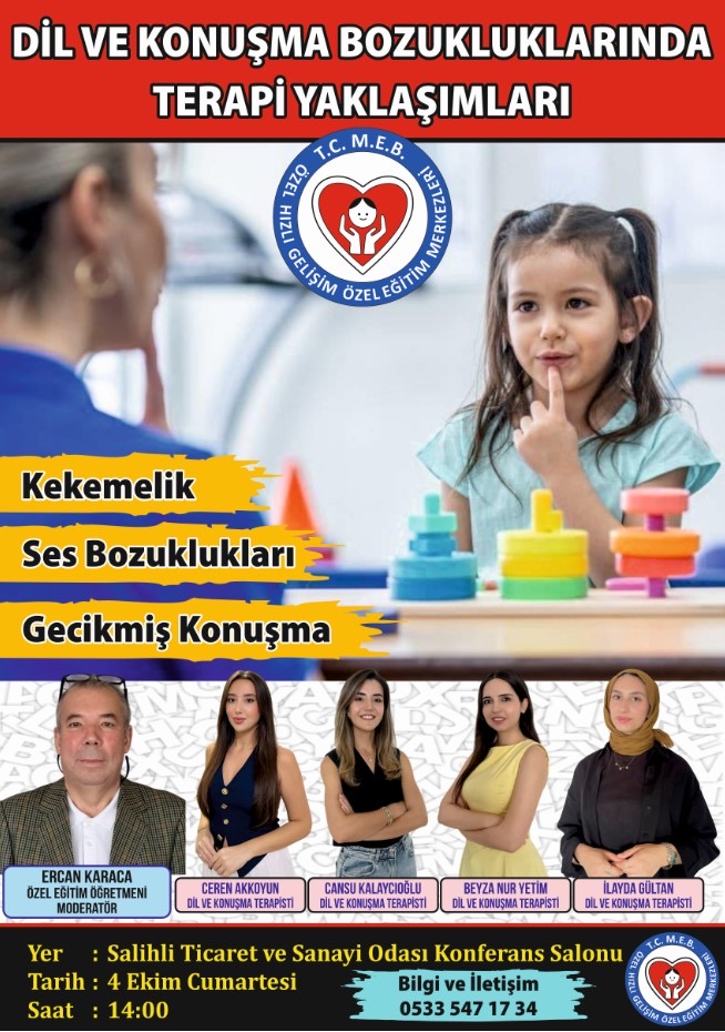 Salihli’de dil ve konuşma bozuklukları üzerine önemli bir etkinlik düzenleniyor. “Dil ve Konuşma Bozukluklarında Terapi Yaklaşımları” başlıklı konferans, 4 Ekim Cumartesi günü gerçekleştirilecek.