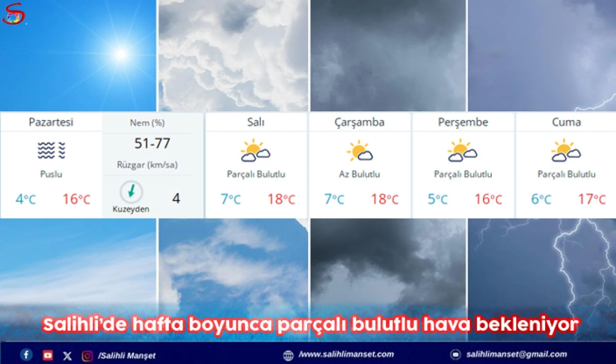 Salihli’de hava durumu raporlarına göre kent merkezinde hafta boyunca parçalı bulutlu bir hava bekleniyor.