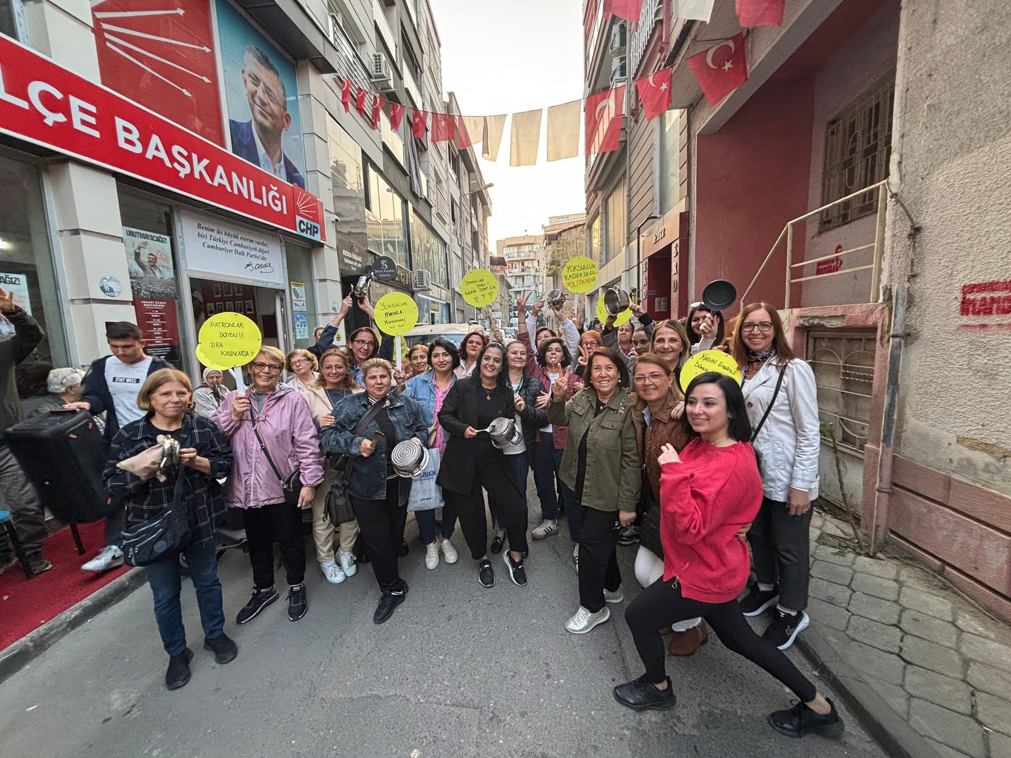CHP İlçe Teşkilatı önünde ellerinde boş tencere ve pankartlarlabir araya gelen kadınlar, Milli Birlik ve Demokrasi meydanına kadar yürüdüler.