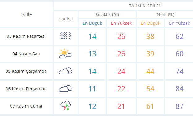 Meteoroloji Genel Müdürlüğü'nün, 5 günlük hava tahmin raporuna göre yeni haftada ilk gün sisli bir hava ile başlaması tahmin ediliyor. Hafta boyunca bulutlu havanın hakim olması beklenirken Cuma günü ise yer yer gök gürültülü sağanak yağış tahmin ediliyor. Hava sıcaklıkları ise gündüz 20 derecenin üzerinde seyretmesi beklenirken akşam saatlerinde ise 11 dereceye kadar düşmesi bekleniyor.