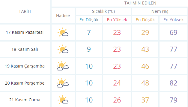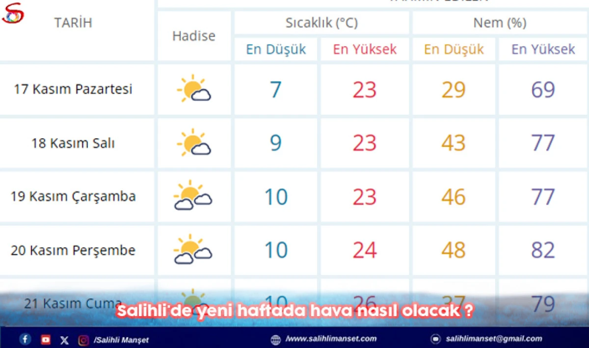 Meteoroloji Genel Müdürlüğü tarafından yapılan son değerlendirmelere göre, Salihlilileri yeni haftada parçalı bulutlu günler bekliyor. Gün içerisinde sıcaklık 23 derece üzerine seyretmesi beklenirken gece saatlerinde ise 10 derece altına inmesi bekleniyor. Gece ve gündüz sıcaklık farkı sebebiyle uzmanlar vatandaşları uyardı.