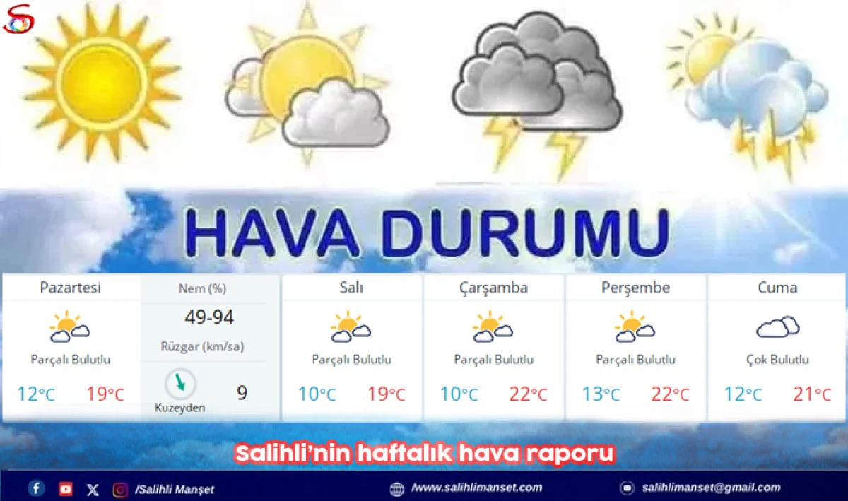 Meteoroloji Genel Müdürlüğü’nden elde edilen verilere göre; Salihli'de yeni haftada parçalı bulutlu havanın hakim bekleniyor.