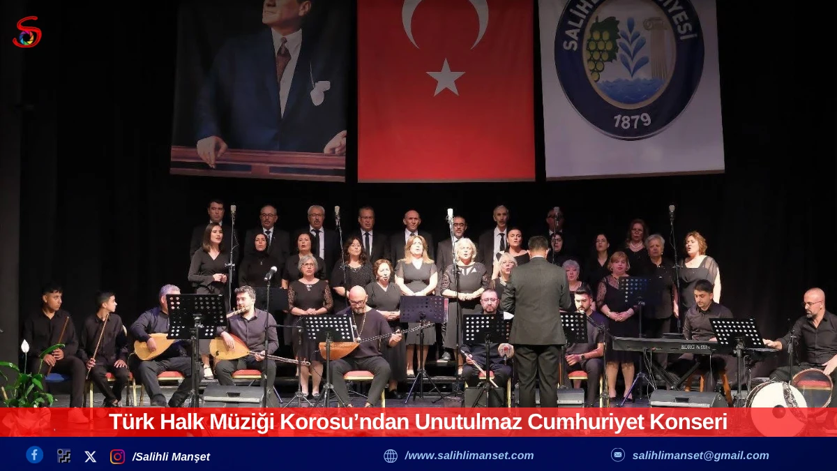 Salihli Belediyesi Türk Halk Müziği Korosu, Cumhuriyetimizin 102. yıl dönümü dolayısıyla düzenlenen “Cumhuriyet Konseri”nde sahne aldı. Şef Yalçın Kutkaya yönetimindeki koro, seslendirdiği birbirinden güzel türkülerle Salihlililere unutulmaz bir akşam yaşattı.